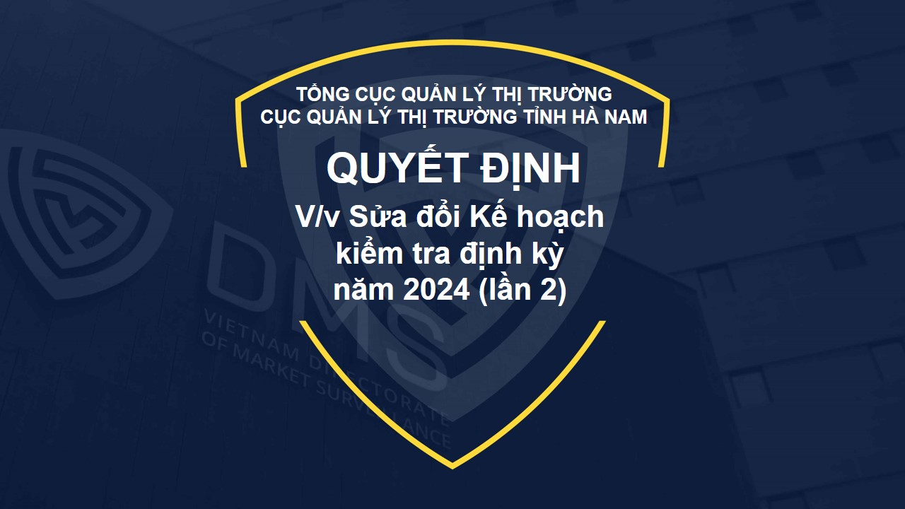 Ngày 30/9/2024, Cục QLTT tỉnh Hà Nam ban hành Quyết định số 700/QĐ-QLTTHNA về việc Sửa đổi Kế hoạch kiểm tra định kỳ năm 2024 (lần 2).