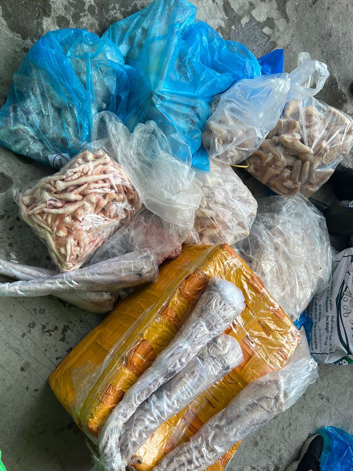 Tại thời điểm kiểm tra, lực lượng chức năng phát hiện hơn 1,5 tấn hàng hoá là thực phẩm đông lạnh bao gồm tràng lợn, đuôi lợn, chân gà, cánh gà, đuôi trâu, chân lợn, gà nguyên con, sụn heo, tai lợn, móng heo, tim heo, sụn vầng trăng, thịt trâu, thịt dải lợn các loại.