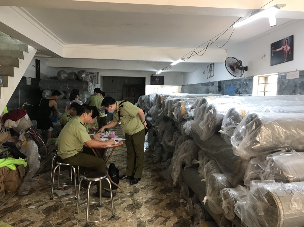 Lực lượng Quản lý thị trường kiểm tra kho vải tại Công ty TNHH Vĩnh Linh, thong Vĩnh Trị, xã Yên Trị (Ý Yên).